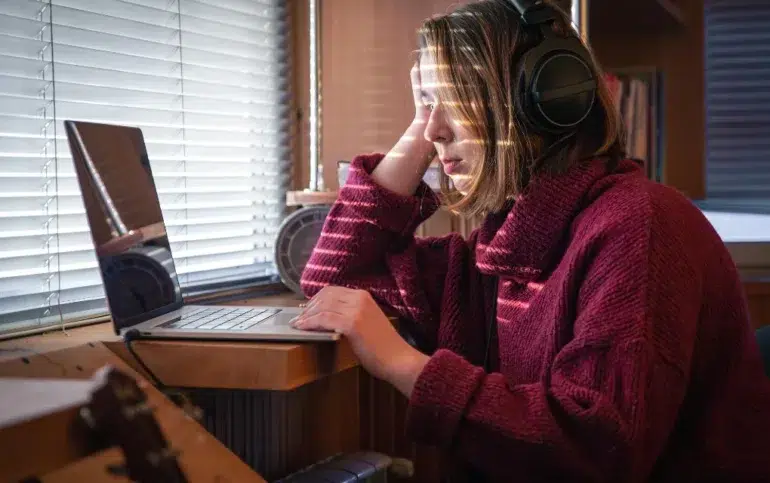 Person in a red sweater and headphones sitting at a wooden desk, looking at a laptop near a window with closed blinds.
